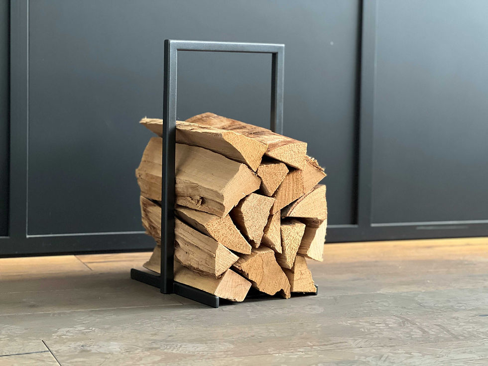 Holz und Metall verbindet Tradition und Moderne. Genau unser Ding! Das Holzlagergestell steht prägnant und doch platzsparend neben dem Cheminée und ersetzt den traditionellen Holzkorb.